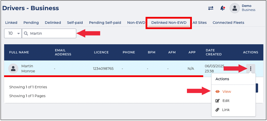 - You can search/filter the list using the Search field to view delinked non-EWD drivers. Using the drop-down arrow beside the Search field, you can also set the list display to 10, 20, or 50.